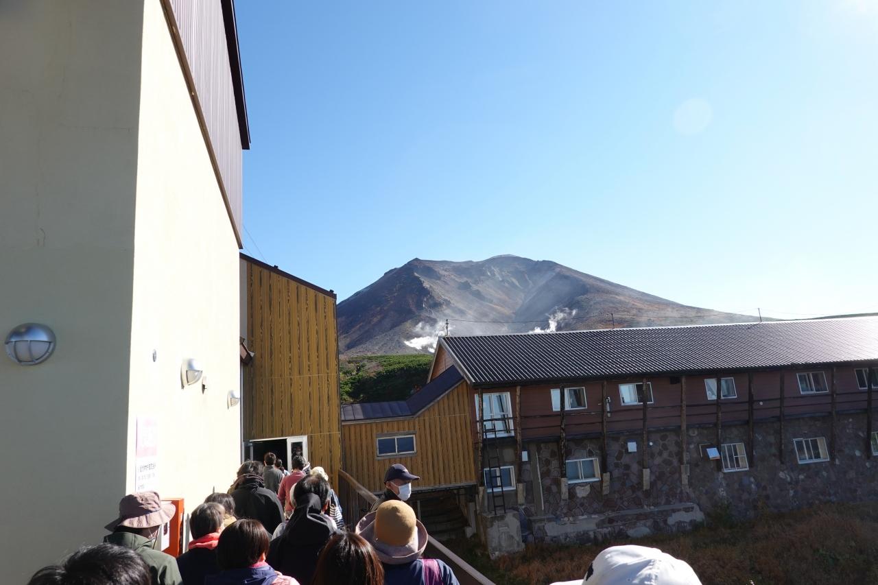 08:31 ロープウェイが着くと、周辺の自然散策夫婦池~姿見の池・旭岳登山について解説があります;周辺の散策道を離れ、旭岳などに向かう人は登山届に記入します。