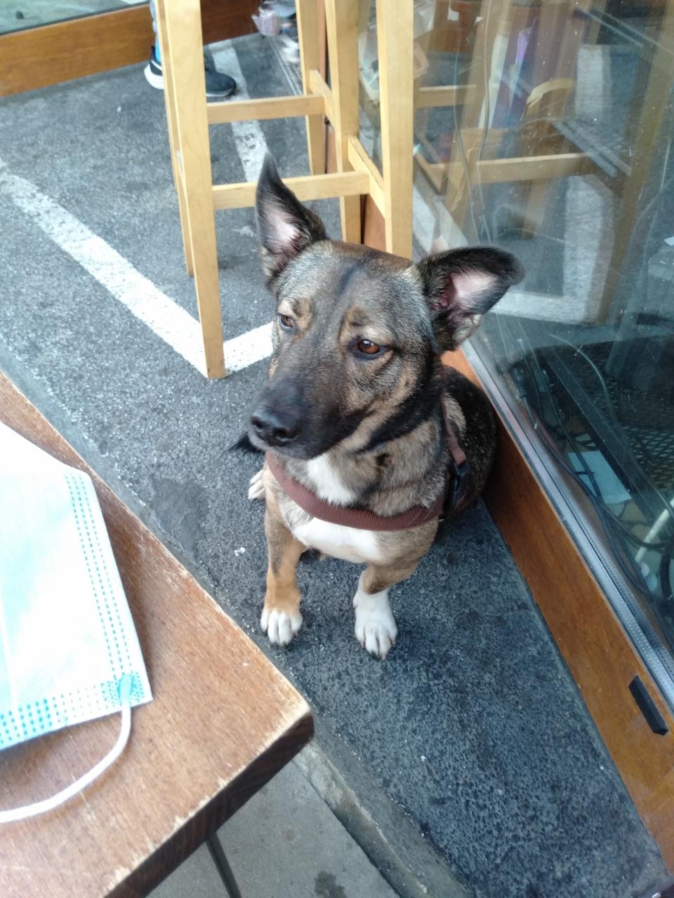 あげようとしたらお店の人に叱られ、ワンちゃんも店の中に連れて行かれてしまいましたが、隙を見て再びやって来ました。 -