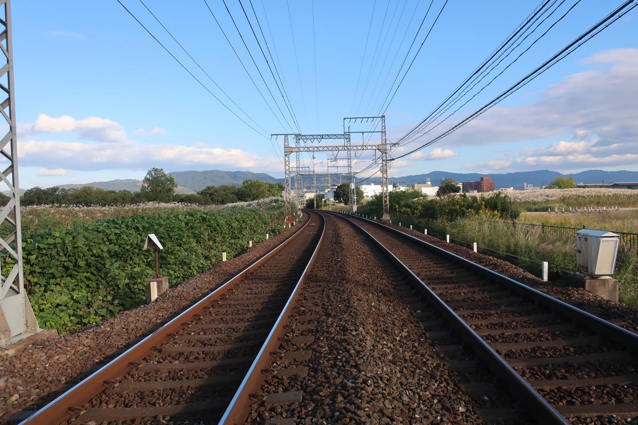 ススキ野の間を電車が走るので、平城京を横切る際にはいつもキラキラと輝いています。
