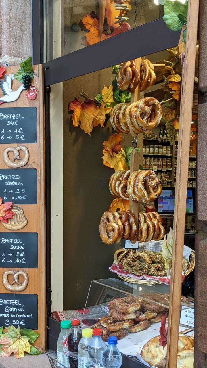 ドイツだけでなくアルザス地方もブレッツエルが名物の様。甘い生地の物、塩付き、胡麻付き等々・・でも観光地なのにドイツより安いかなあ、とも思う。