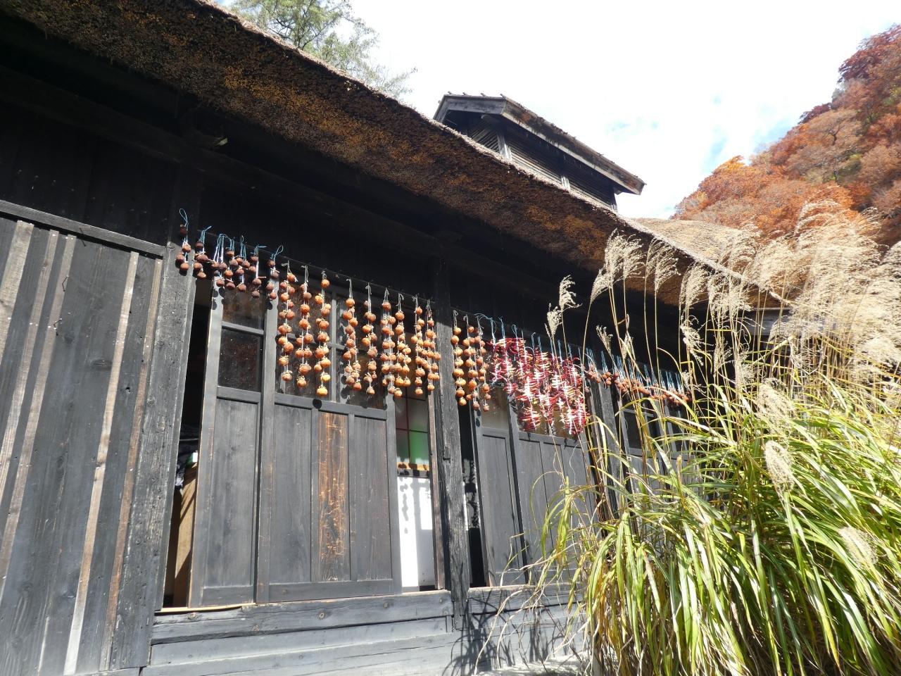 今なお警護の武士が詰めた茅葺き屋根の長屋「本陣」が残っている。 -
