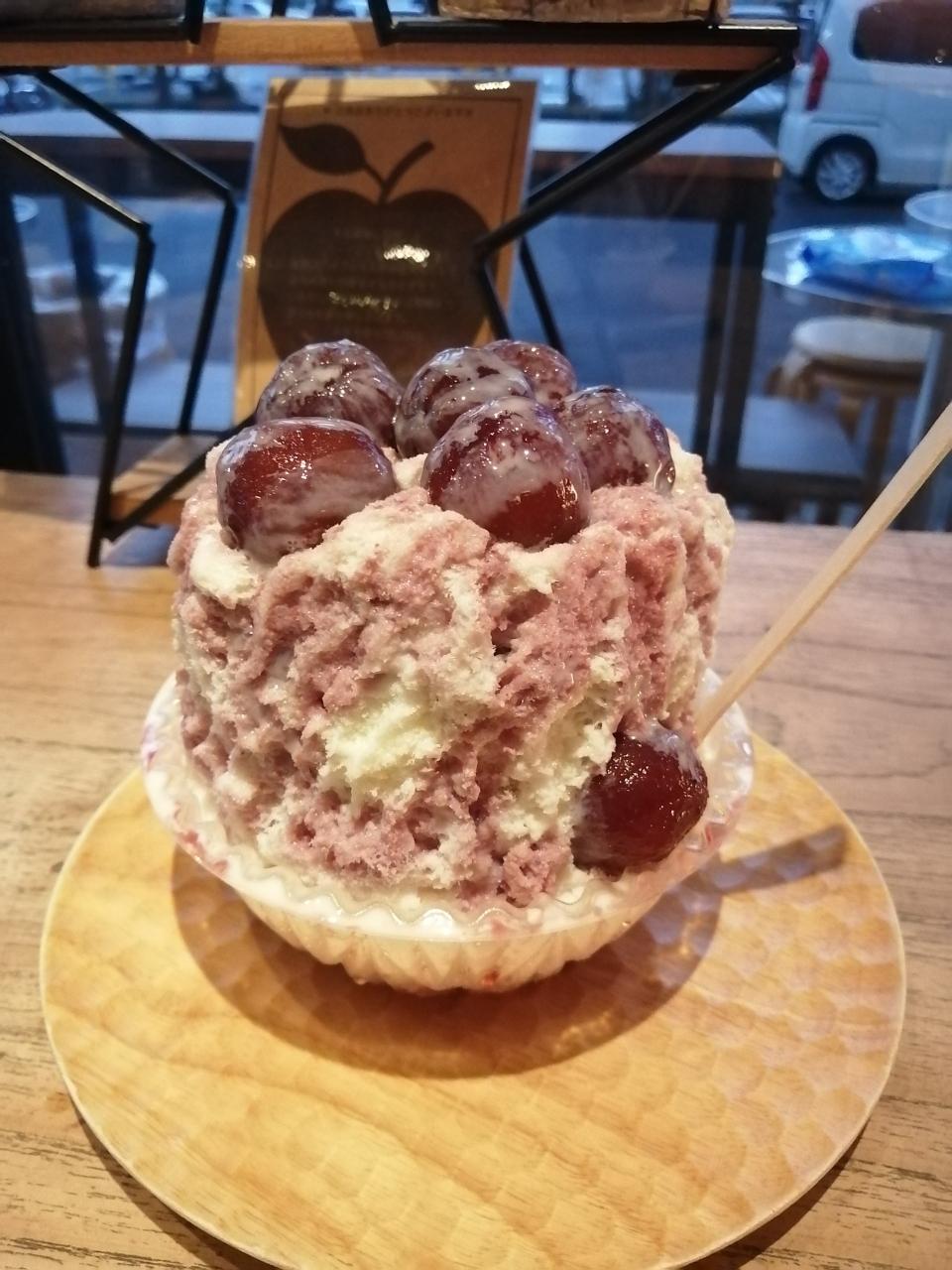 1杯食べ終わった後にまだ余裕があったので追加注文しました。どちらを食べるか悩んでいたので両方食べることができてよかったです。こちらの方がかき氷部分もブドウ味がしました。ちょっと味がしつこい感じがしたのでシャインマスカットの方が好きでした。 -
