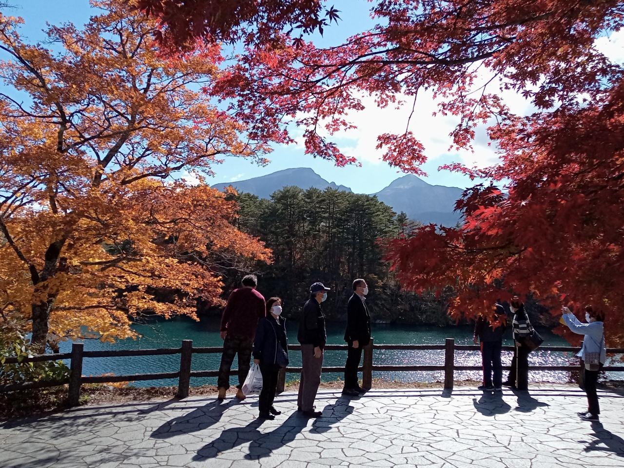 左側を向くと毘沙門沼は美しいです。人はいますが静けさも漂いますし、オレンジ色の艶やかな紅葉とのコラボも美しいですね!