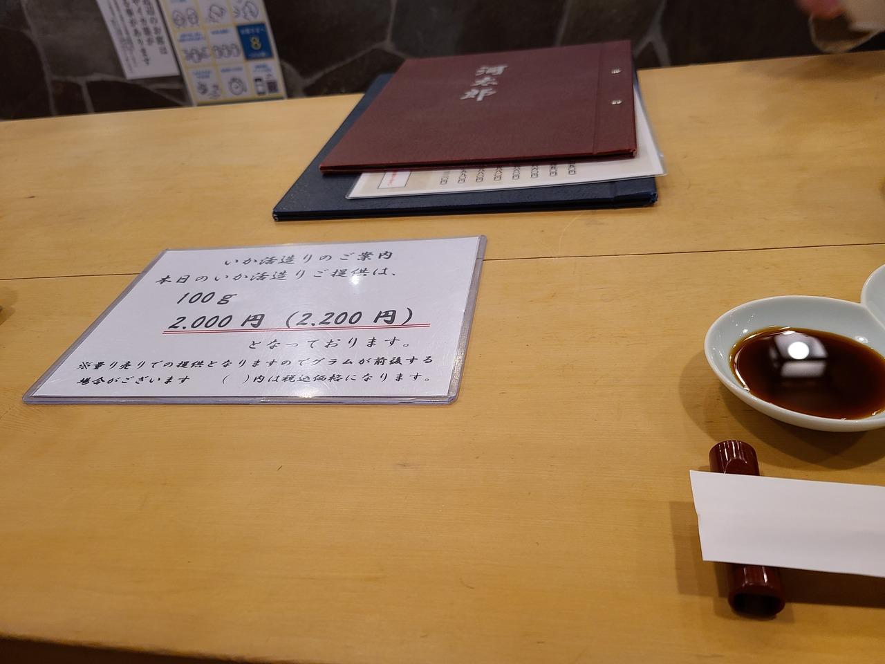 予約時に〈いか活造り御膳〉3,080円と知らせてあります。本日の〈いか活造り〉は100g税込2,200円との事です。