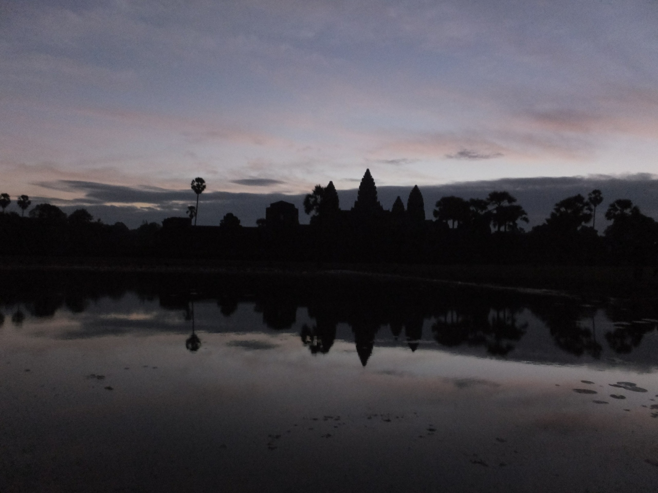 だんだんと明るくなってアンコールワットのシルエットが暗闇から浮かび上がってくる。