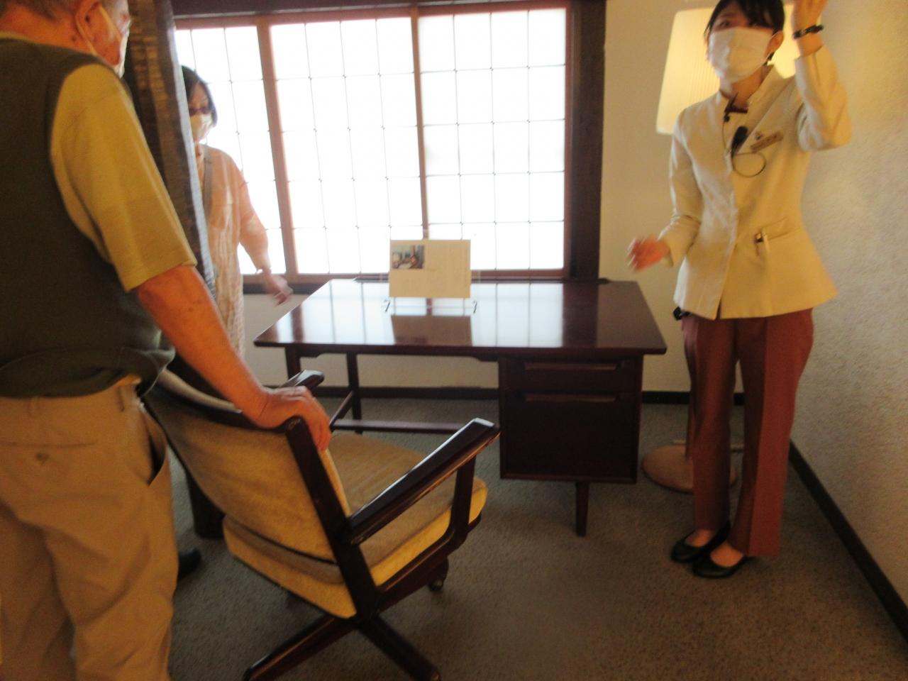 ホテルのスタッフがガイドとなって説明をしてくれました。このホテルを作った村野藤吾さんは家具の設計もしていて木材の特徴を生かした緩やかな曲線のひじもたれがついた椅子を紹介していました。確かに一つ一つデザインが違います。