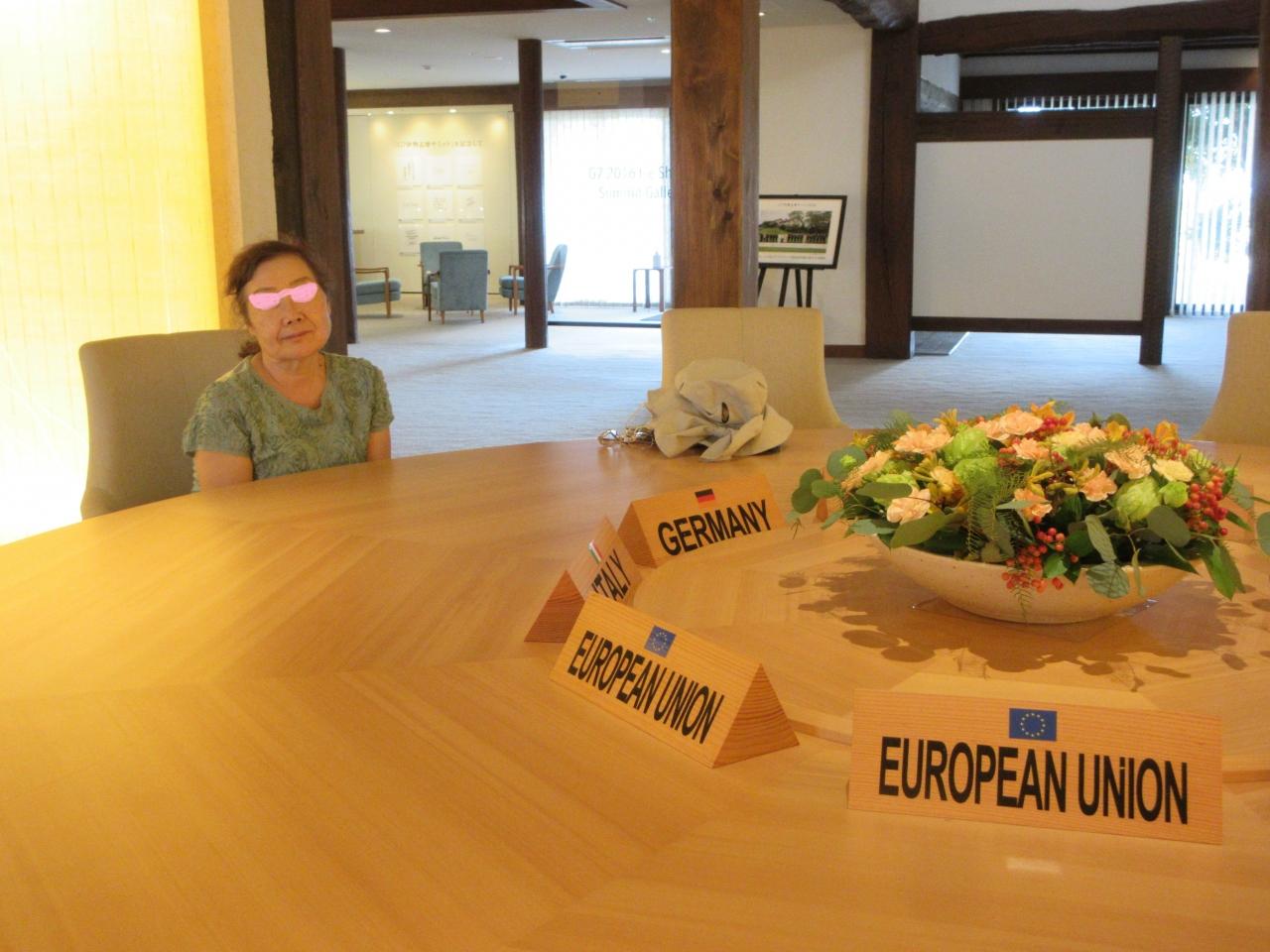 G7で使われたテーブルの一つ。実際にこのクラブハウスで使われたものです。日本の場所に使われている木目が一番美しいとのこと。素人の私が見てもわかりませんが。