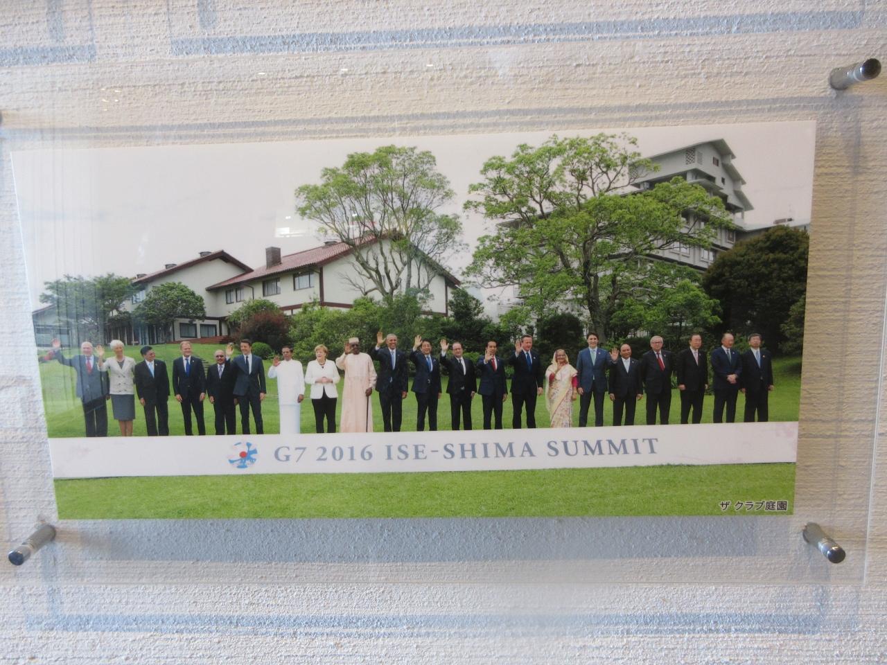 クラブハウスの一角にG7サミットのコーナーがあり、様子がわかるように掲示がしてありました。二階を見上げると梁が見えますが、この梁の太さが一定ではありません。原木の特徴を生かして使っているのでまちまちの太さの梁があります。