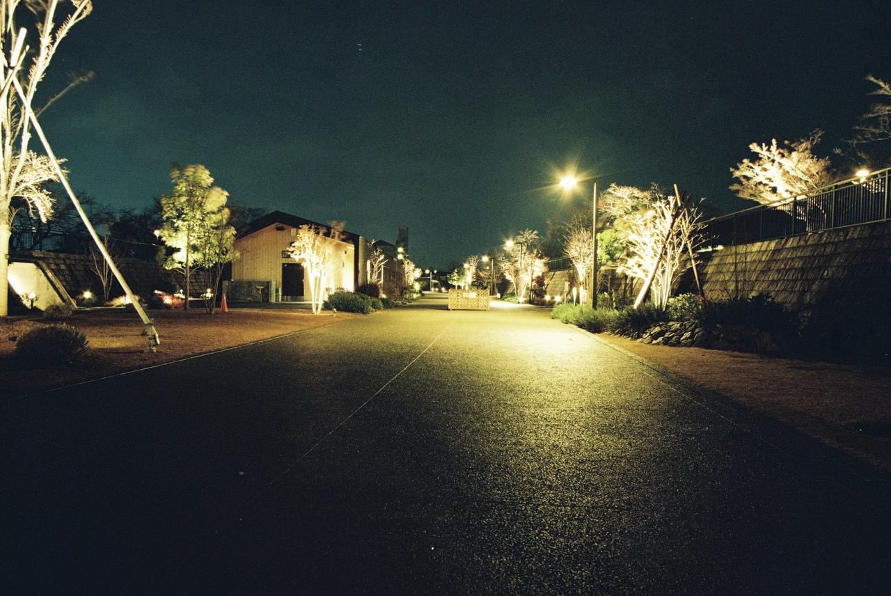 そのままエイスクエア迄暫く歩いて行く。デュオワールドとアルプラザ草津が中核となるショッピングモールだが、開店後数回改装を経て店舗の位置が毎回変わっている様に思える。ただオシャレ感は毎回来る度に上がっている様で、まちイルミとは違うが、独自にイルミネーションイベントを行っており、こちらもカメラに収めて行く。ただエイスクエアのイルミネーションを全てカメラに収めるにはこの広大な敷地をグルりと回らなければならないため、駐車料金のこともあり入口付近だけに留めて戻ることにした。草津駅へと戻る街路樹にもイルミネーションは掛けられてはいるが、やはり並行して走行する車の事を考えてか明るさはイマイチであった。そういった暗めのイルミネーションはフィルムカメラにとっては苦手な要素でしかなく、それを補うために三脚を立ててシャッター速度を遅くするには通行の邪魔になる。おまけに自転車も通ることを考えれば〝危険要素〟も増すため、ビルの入口から数枚撮るだけに留めておく。そんな感じで三脚を担いで撮影方向を確認しながら歩いていた時に事件が起こる。歩道に敷かれているタイルの段差に躓きひっくり返ってしまった。学生時代にマンションやアパートで育った子供がハイハイをしないでつかまり立ちが出来る様になってしまい、躓いた際にパラシュート反応が起こらず、顔面を打ち付けることがあると授業で習った。幸いなことに昭和の時代に田舎の一軒家で育った私は、咄嗟に手を着くことは出来た。しかし体の衰えは否定できず、あと一歩足が出たら転ばなかったのに~と思ったが後のまつり。カメラ本体は無事だったもののレンズの縁が変形、スマホアダプタは破損しiPhone12Proは地面を滑った。そして当の本人は顔こそ大丈夫であったが左手一ヶ所右手二ヶ所の擦り傷を負う。結構ド派手に転んだがこういった際には〝見なかったふり〟をして貰ったことがありがたかった。