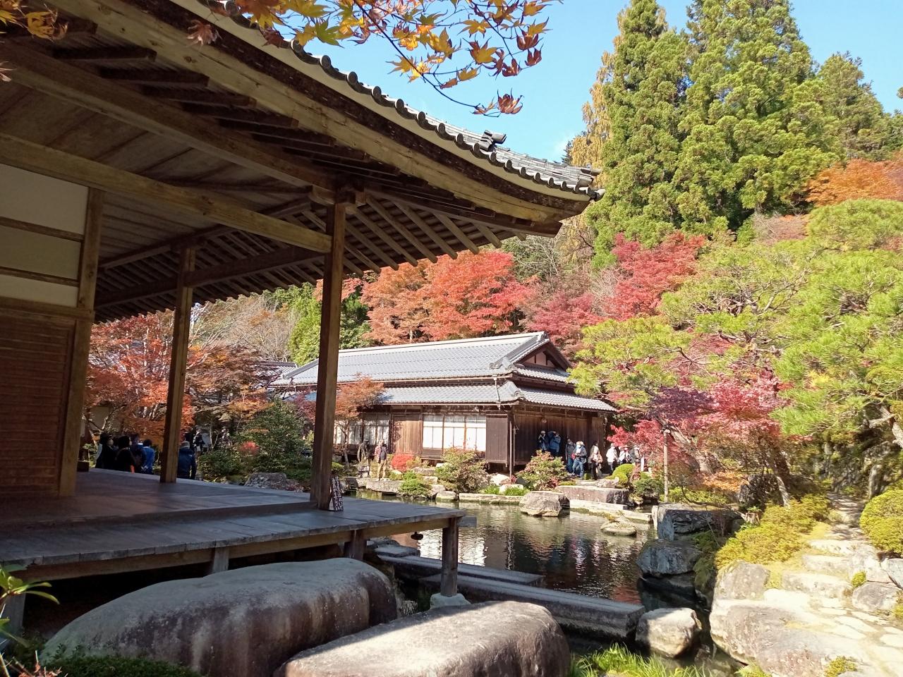 それにしてもこの光景、青空の下でとてつもなく美しいですね!しかも広い庭から離れてからの景観、京都や東京の紅葉寺院とはまた一味違います!絶句します!