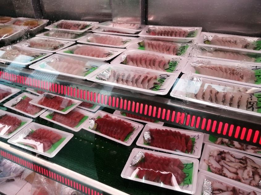 沖縄の魚屋さんにはこんな感じにお刺身が売られているとの情報を得てやってきたのですが、食べたい魚がたくさんありすぎて、でも全部買うには多すぎるので迷いまくっていたら、1000円でいろんな魚を少しずつ入れたパックを新たに魚を切って作ってくれました。