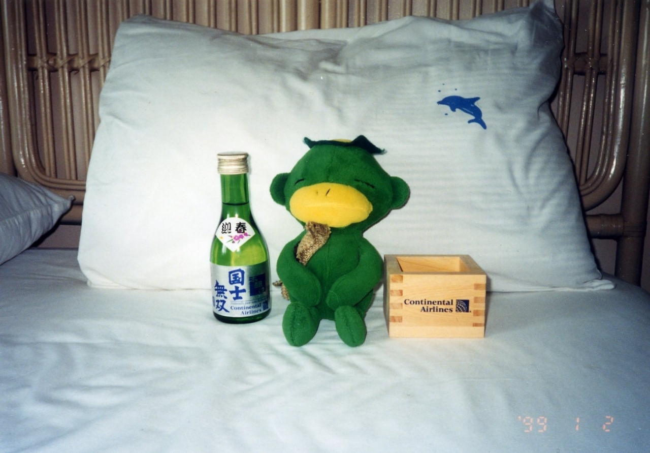 コンチネンタル航空が振る舞ってくれたお酒と枡。昔はこんなふうに豪気でしたね。クリスマスに搭乗するとエコノミークラスでもターキーが機内食で出ました。