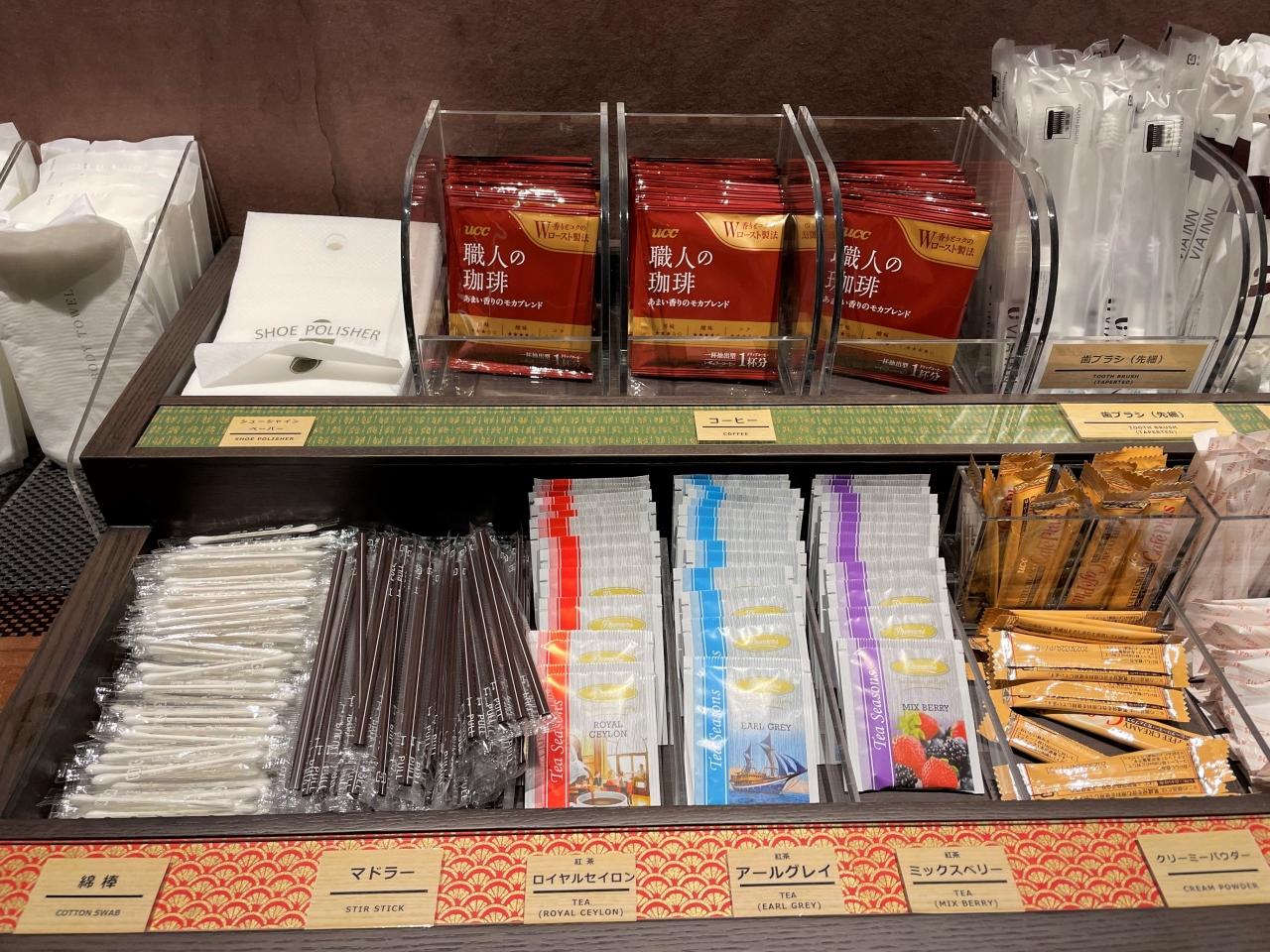 チェックインの際に1階で歯ブラシと珈琲&ティーを