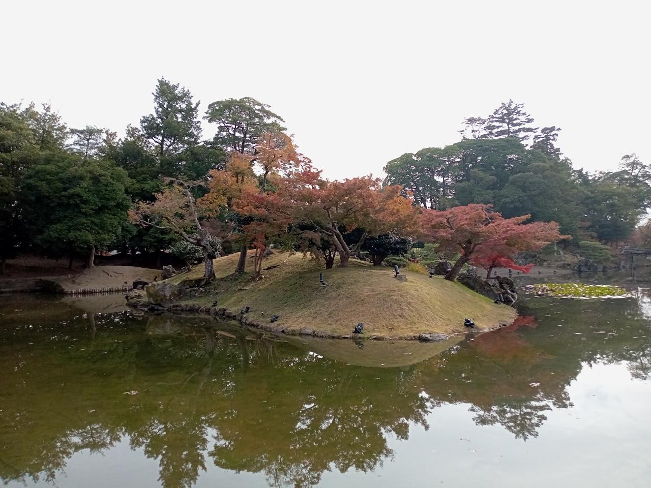 天守閣が今度は島の紅葉の左側に見えます。池の水面には天守閣は映っていないです。もしかしたら池沿いの石の転写と重なっているのかもしれません。
