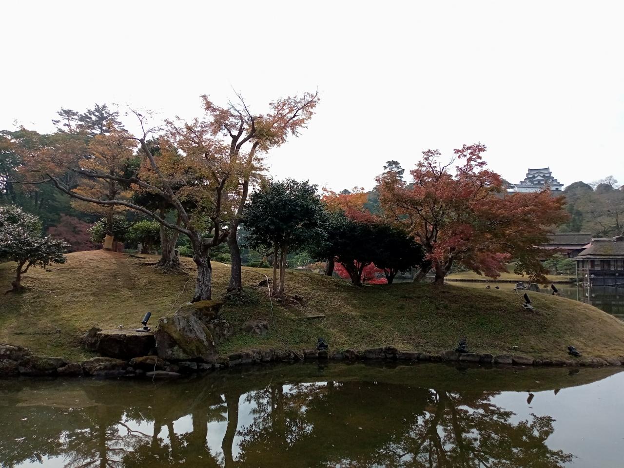 そして順路に向かって右側をみると先ほど訪れた彦根城の天守閣が見えます!昨夜もここから天守閣のライトアップが異次元の美しさで見えました。明るい時間帯でも池や紅葉の木など庭園越しから見えて素晴らしい光景です!超稼働します!