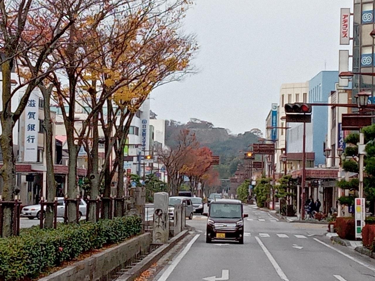大手門と反対側から夢京橋キャッスルロードです。だいぶ遠回りして玄宮園から約20分かかりました。古い家並みとイチョウ並木が見えて良い景観ですね。
