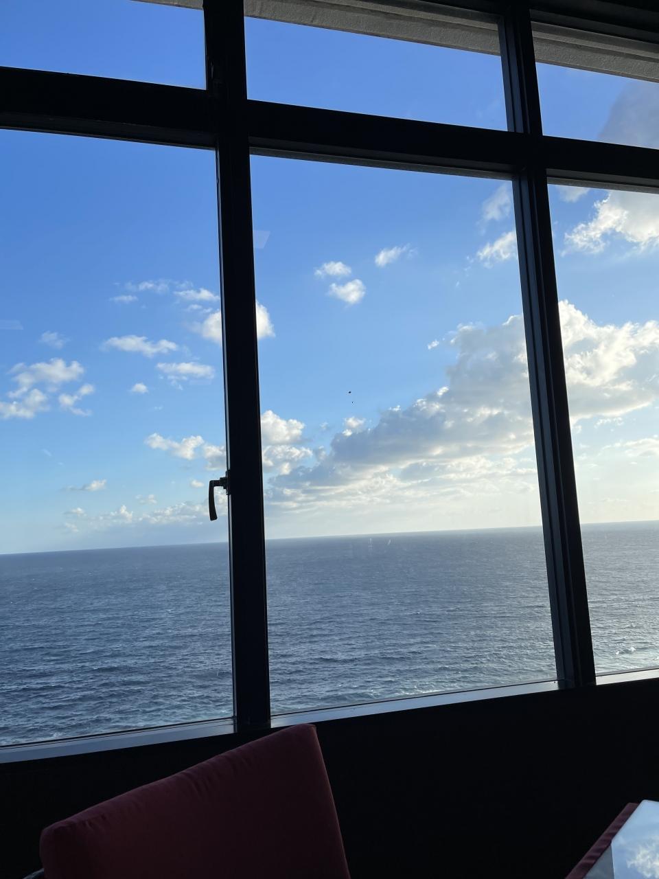 ホテルの案内の人に部屋を案内してもらう途中、部屋のある階のエレベーターを降りたところで窓から海が見えたのですが、きれいで驚きました。