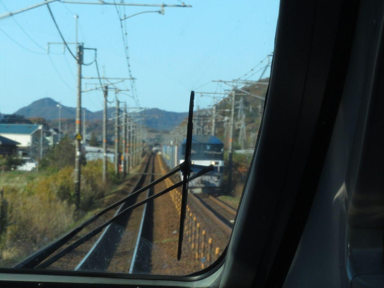 貨物列車とも頻繁にすれちがうが、ワイパーでこのとおり。 -