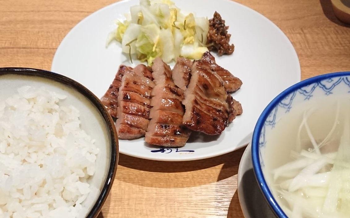 小福定食の内容は、牛たん焼き2枚4切れと浅漬け、南蛮味噌。