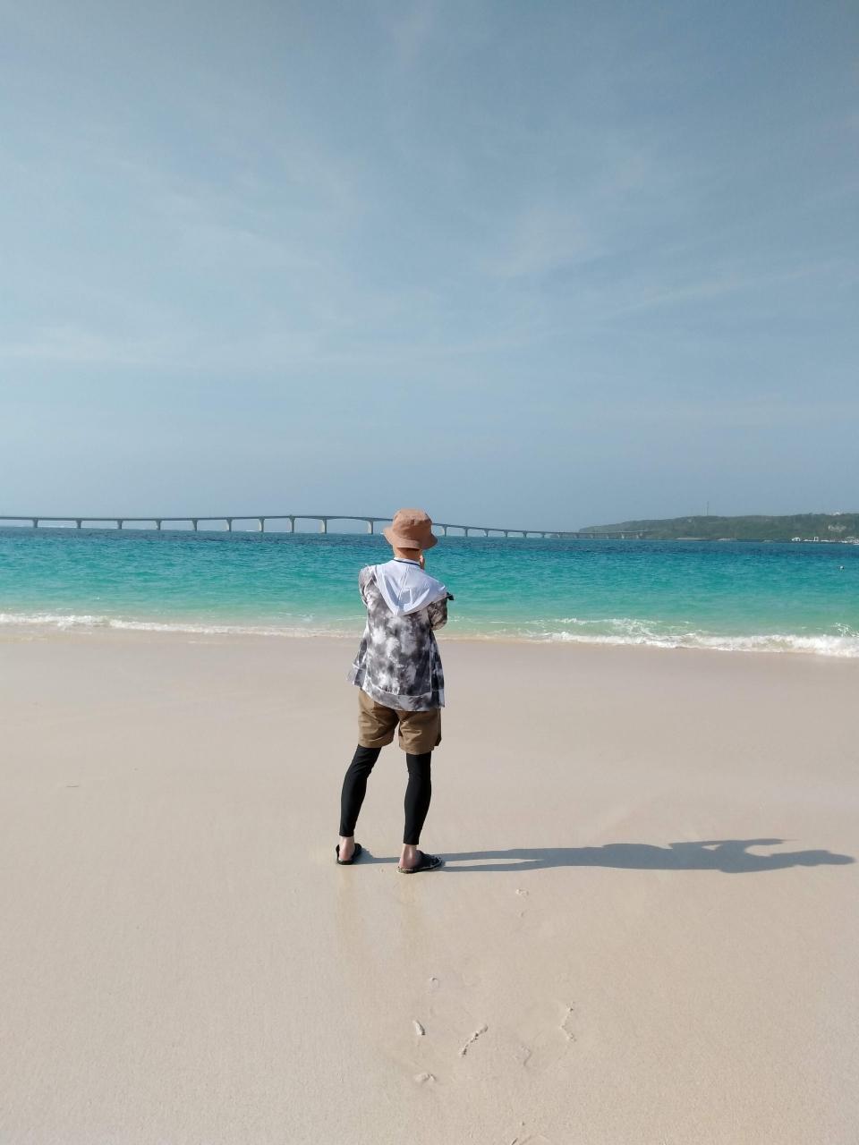 まだ台風の影響で波が荒く、泳げるかどうかチェックしながら