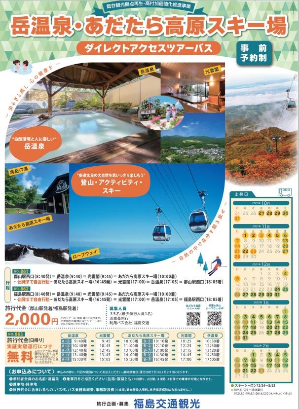 「岳温泉・あだたら高原スキー場・ダイレクトアクセスツアーバス」は、2021/10/27~2022/02/23の機関、 福島駅又は郡山駅からの往復と岳温泉・スキー場間を運行するバス。「既存環境拠点再生・高付加価値化推進事業 実証運行」のため、たぶん補助金などが出ているので、格安金額設定となっているのでしょうか。