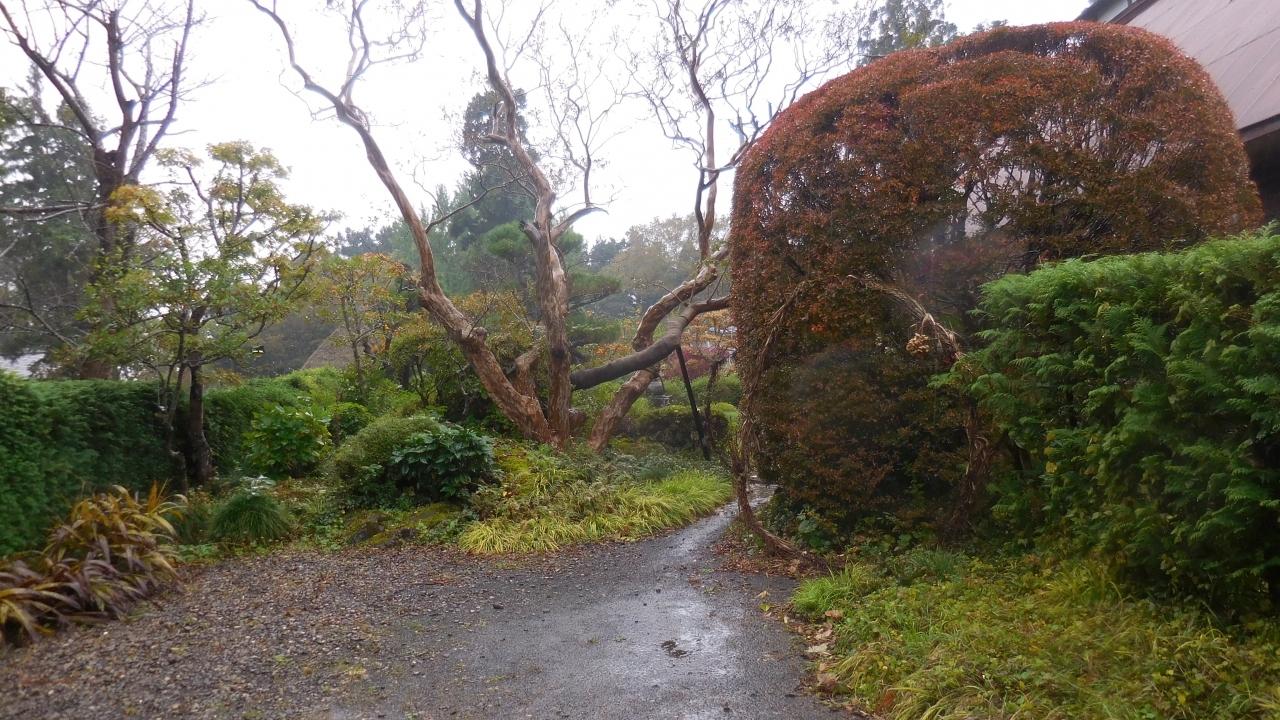 秘湯とレトロ旅館を巡る旅の最後は重伝建で締めくくる。金ヶ崎町には伊達藩の要害を中心とした武家町が残っており、街路に面して屋敷が生垣と屋敷林に囲まれているのが特徴だった。保存地区全体が林の中に佇んでいるようで、折からの雨で緑と紅葉がしっとりと鮮やかだった。
