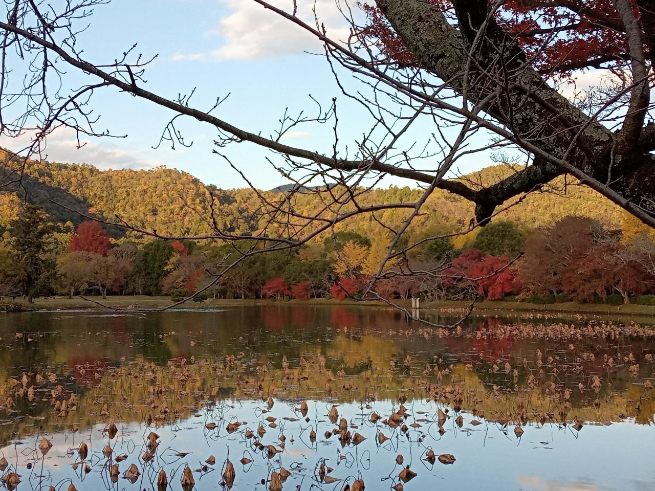 遠くから見ても真っ黄色と赤の紅葉が艶やかなのが見えます!大沢池も広い上に紅葉や雲が無風で綺麗に映し出されているので、まさに絶景です!