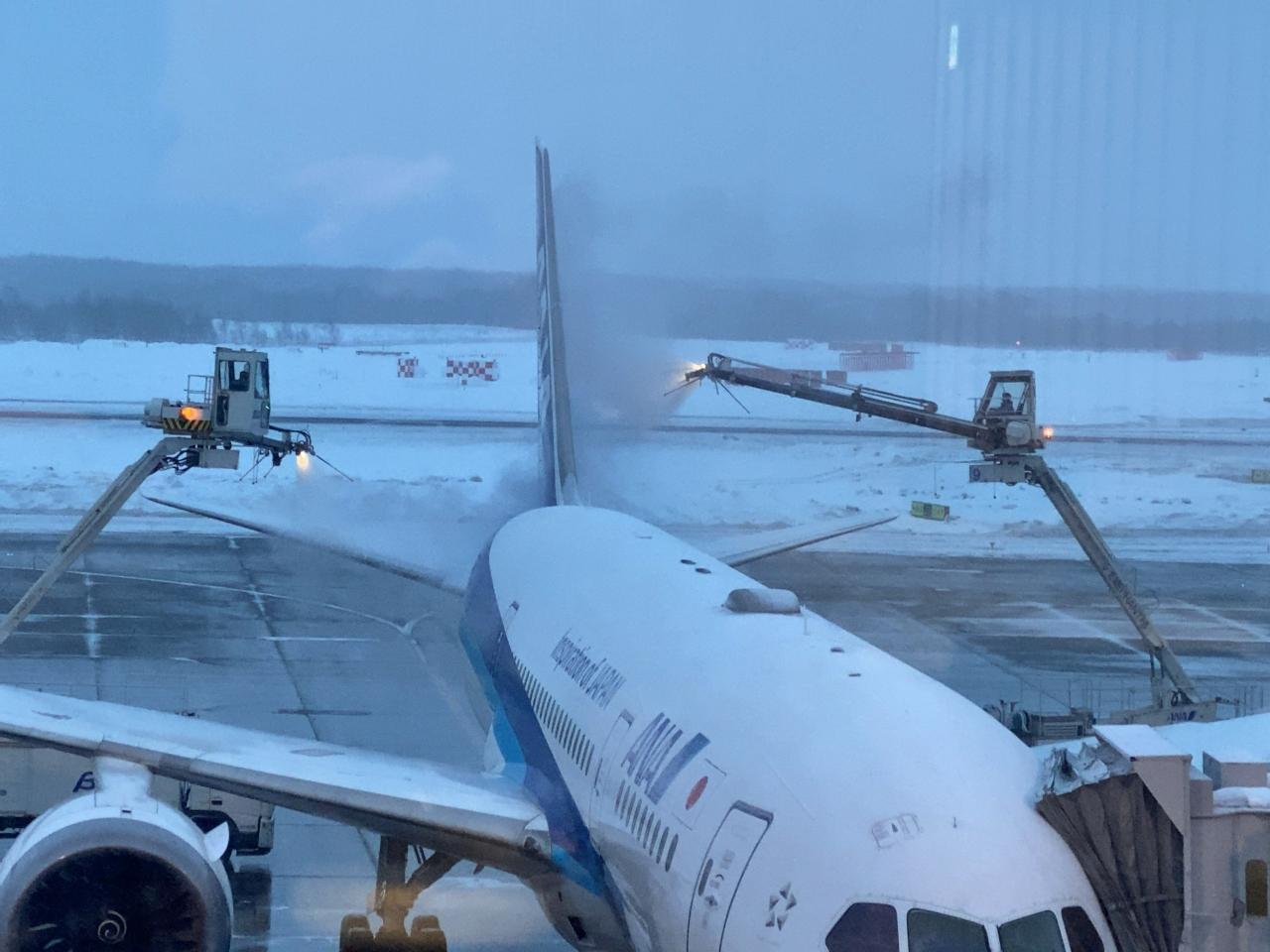 ANAの飛行機は、2台の散布車を使って両側から薬剤をかけているが、エアドゥは、1台の散布車が片側ずつ薬剤をかけるので、出発に時間を要した。 -