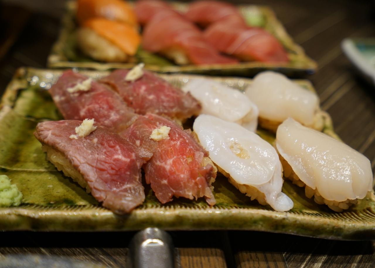 「肉寿司北海道産山わさび添え寿司」×2「水たこ」と本日のお薦めお寿司