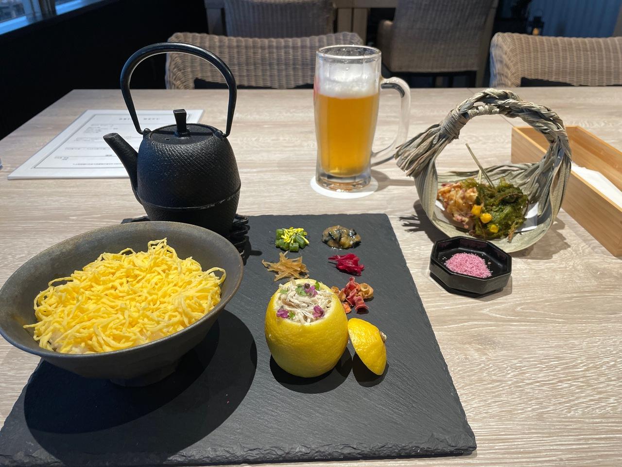 横にある、くり抜かれたレモンの中には湯掻いた鶏肉が入っていて、