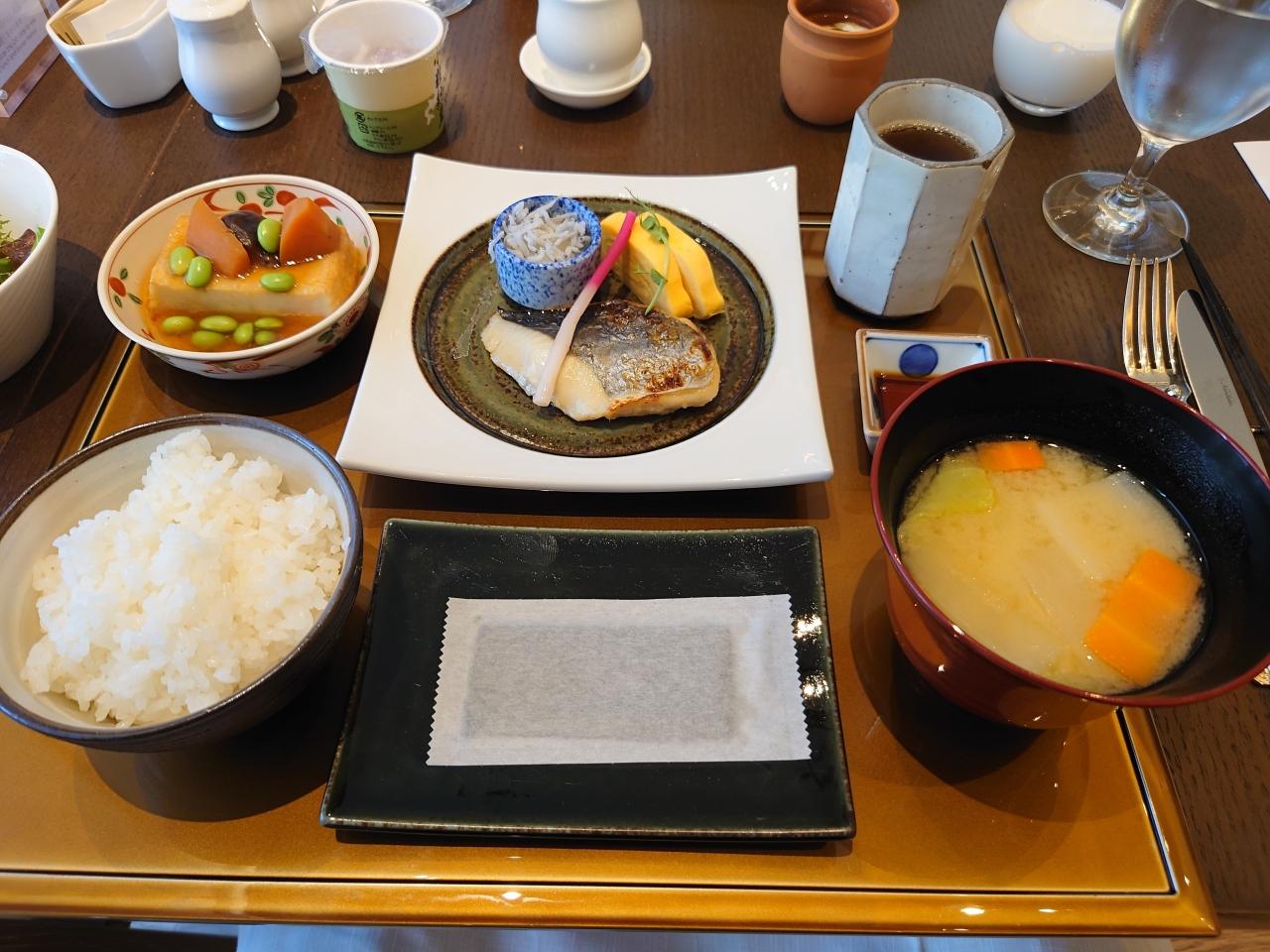 私と家内は和食を選びました。和食は焼き魚や煮物、ごはん、そして味噌汁は飛鳥汁というミルクの入った味噌汁に変えることもできるということでお願いしました。内装も含めてすばらしく、とてもおいしい朝食でした。