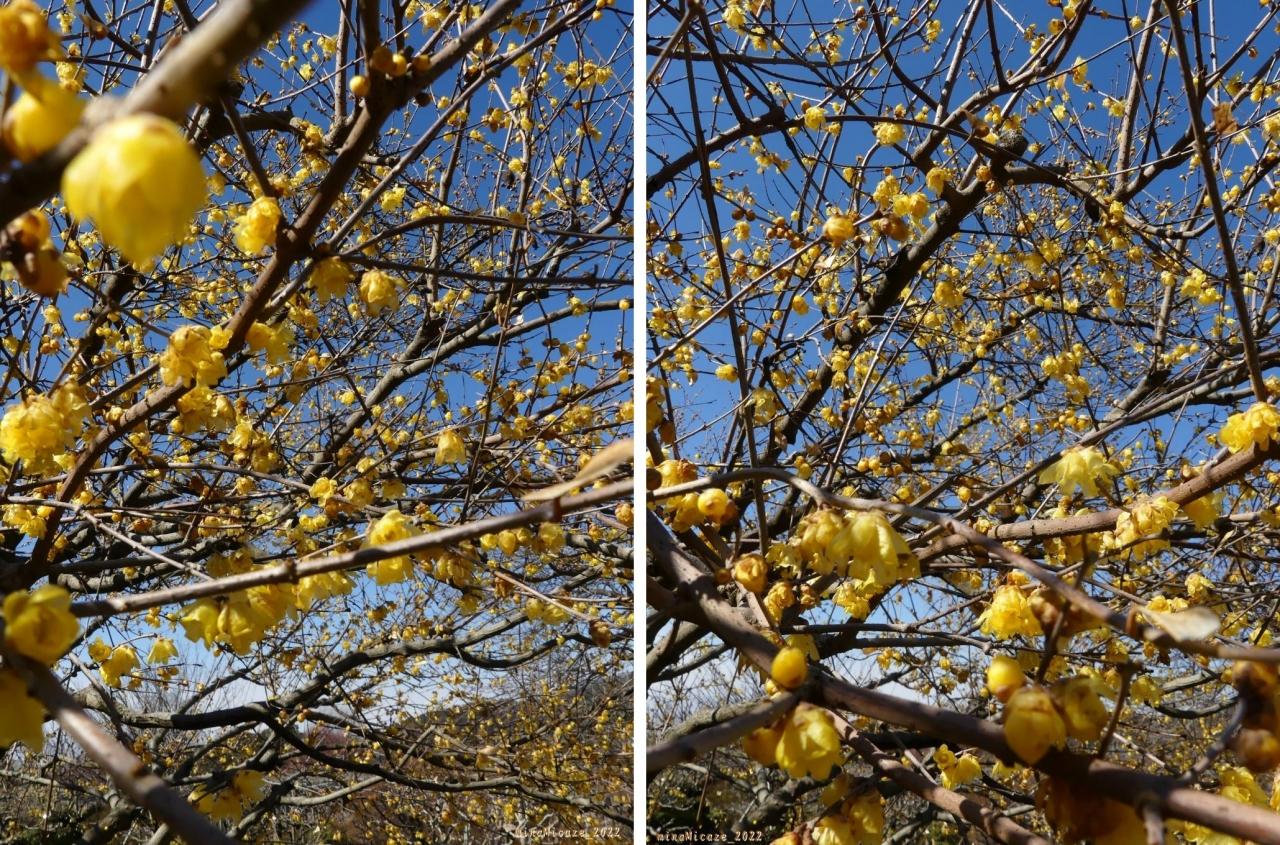 南の山では、ロウバイや寒紅梅が綺麗に咲いています。