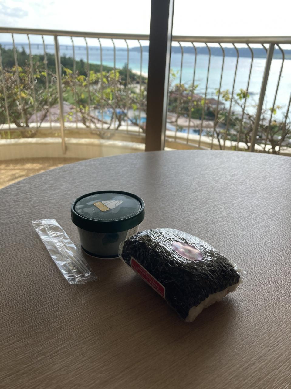 まずは、朝から大して何も食べていなかったので、下の売店でSPAMおにぎりとアイスクリームを買ってきて部屋でいただきます。