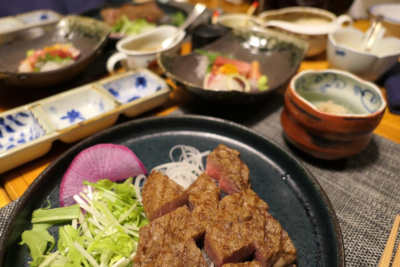 「からまつ」の夕食「信州牛サーロインステーキコース」。