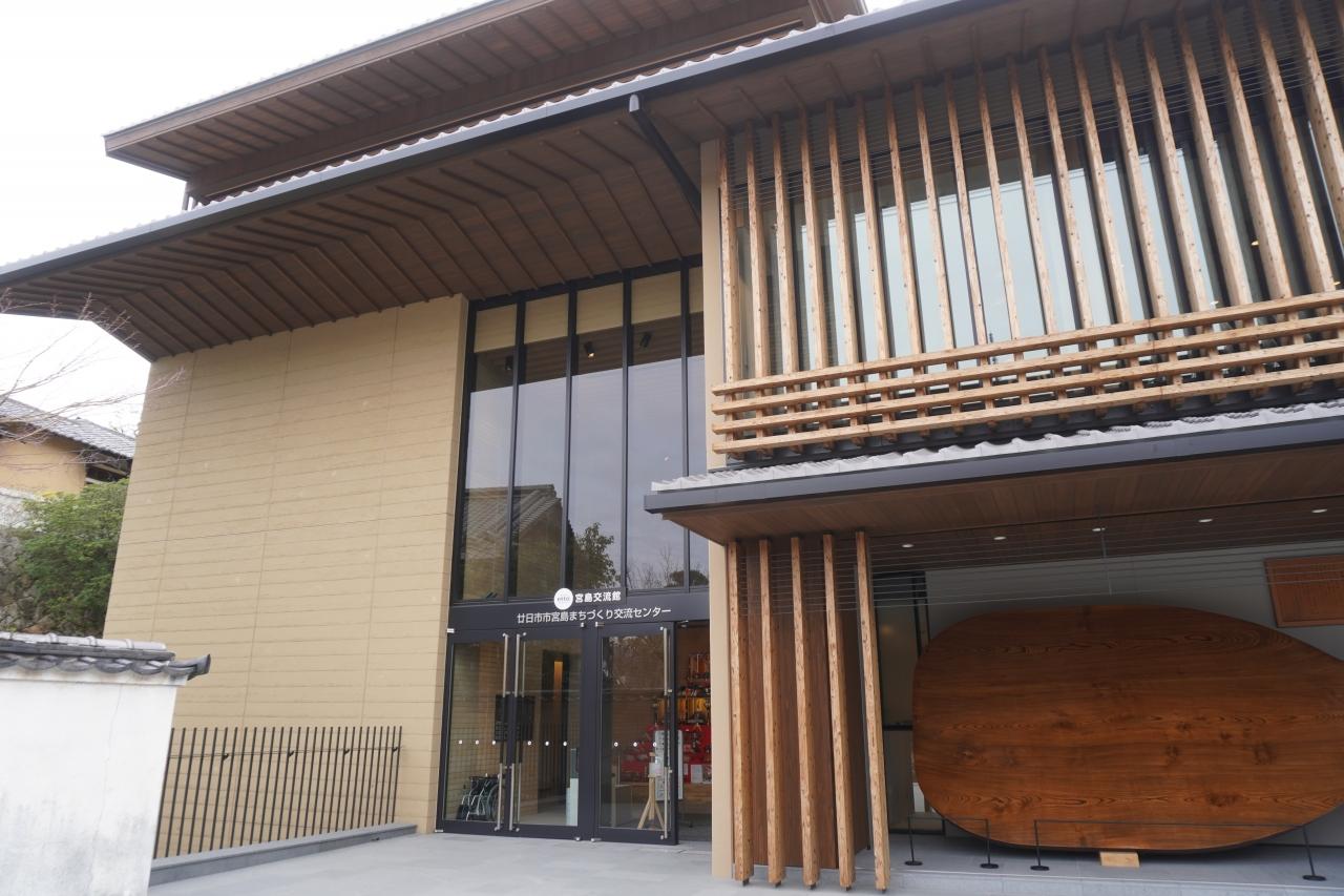 etto宮島交流館は、町家通りから塔之岡のトンネルをくぐって出たところ。坂の上に立派な建物が見えています。 -