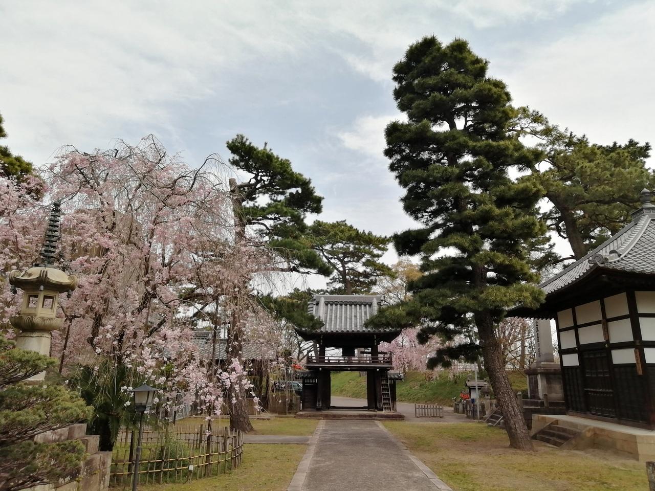山門前のしだれ桜はまさに満開。