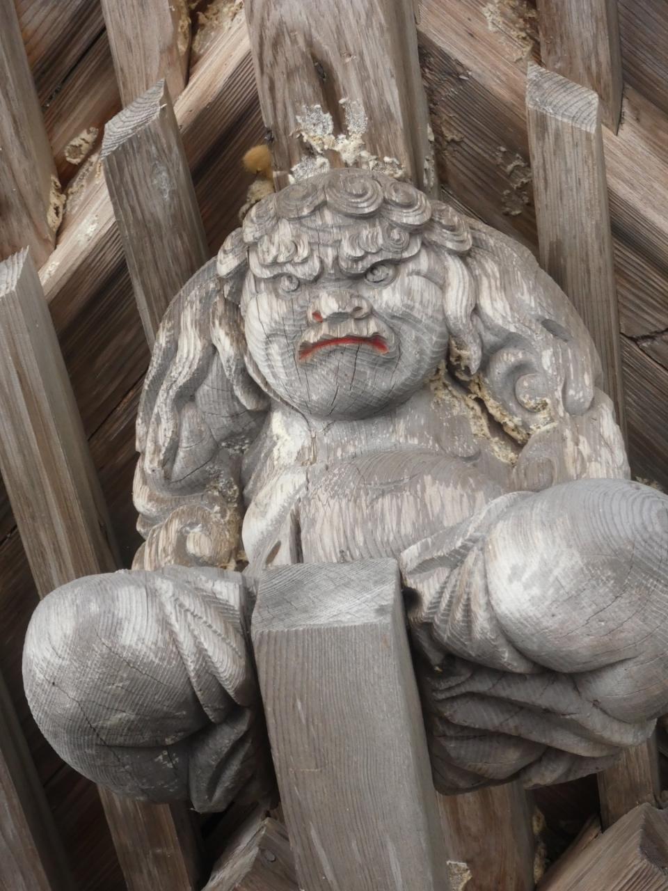 この神社を取り囲むように、力士像が梁上に乗っている。