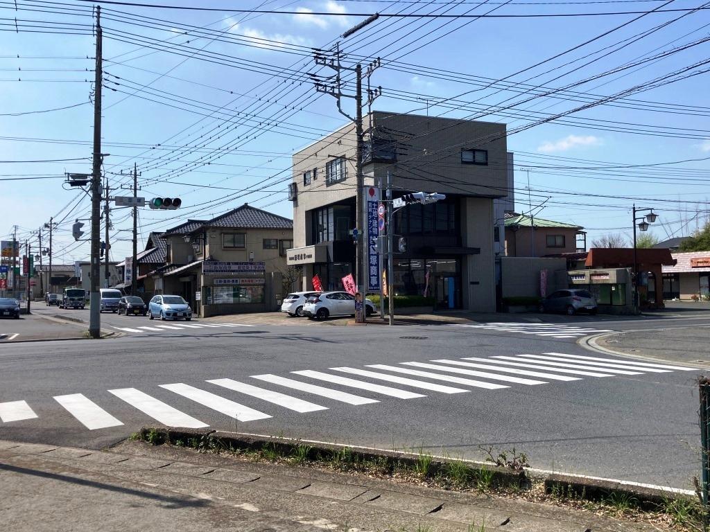 手前の道(国道464号)は左(西)へ行くと、印西、千葉ニュータウンへ向かい途中に宗吾伝説で有名な「甚平渡し」を通って印旛沼を橋で渡る。右(東)へ行くと、公津の新興住宅地や成田日赤を通って成田駅前、そして成田山へ向かう。