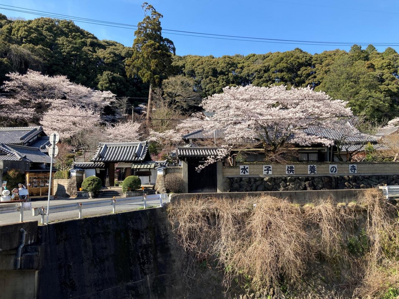 竜田川の向こうに桜の木々に埋まるような寺。塀に「水子供養の寺」と書かれています。