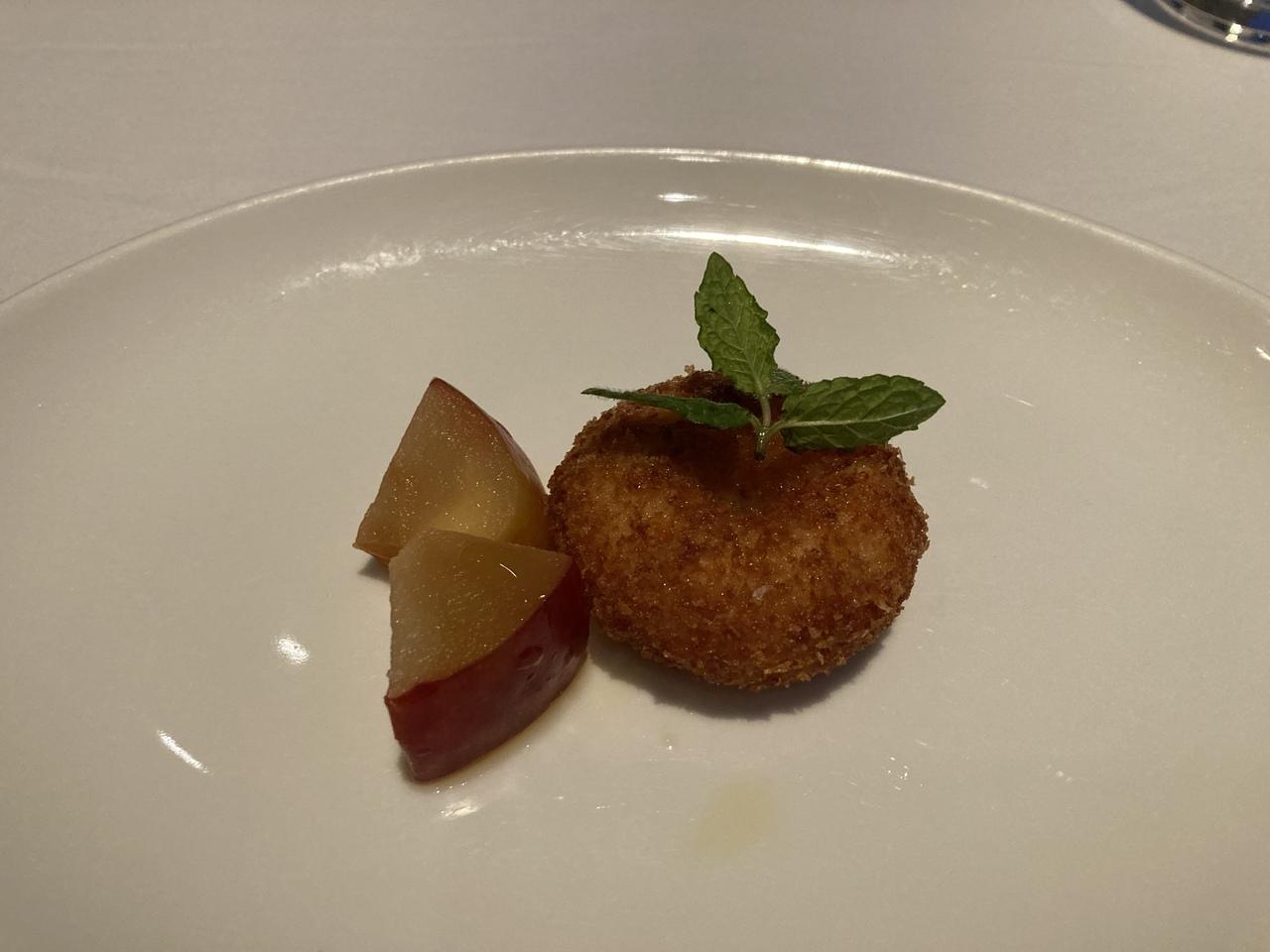 前菜は「紅ズワイ蟹のクラブケーキ」と「林檎のピクルス」。濃厚なクラブケーキと、酸味が心地よいピクルスが良く合っていて、この後のお料理への期待が高まります。
