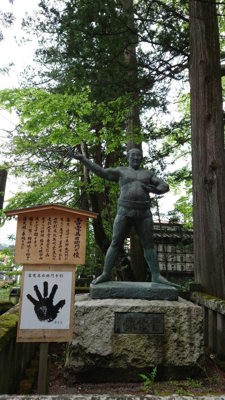 その手水舎近くに江戸時代の力士・雷電為右衛門の銅像と手形があった。そういえばこちらの出身でしたね。