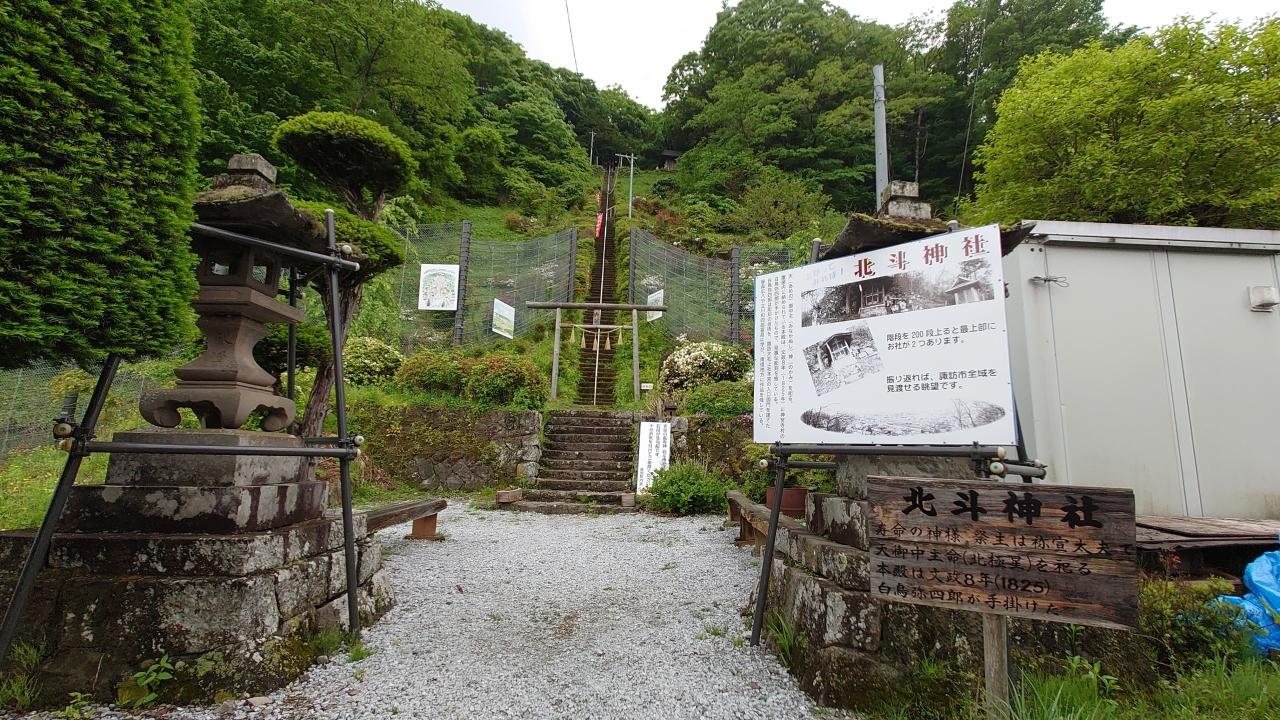 道中の北斗神社は長~い石段の上。ちょっと無理でした……。展望台のようなものがあるのでしょうか、おそらく上まで登った方が下に手を振っていた。(疲労感のあまり応えられなかった)