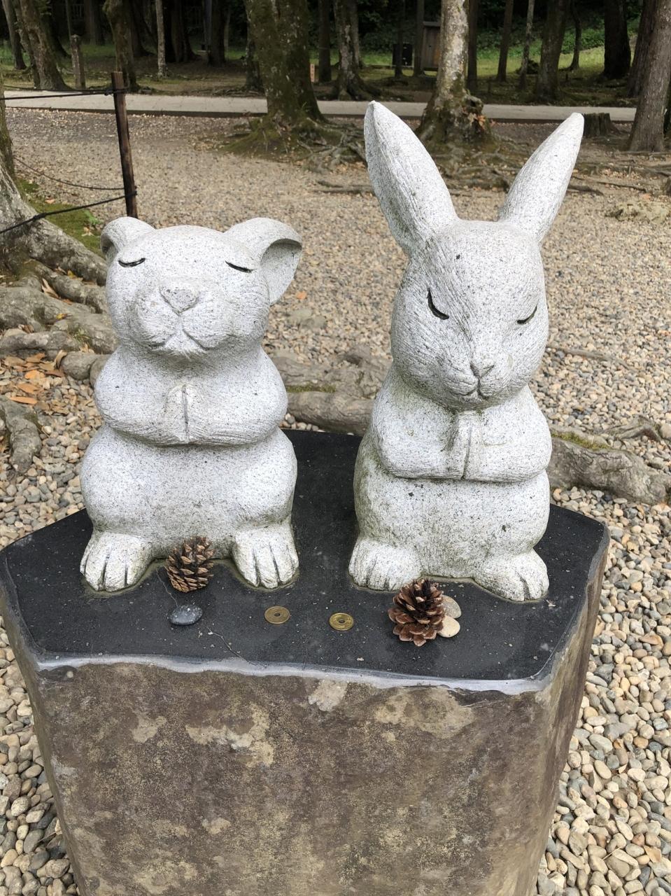 神話「因幡の白兎」を基に作られた「ご慈愛の御神像」の他に、出雲大社境内のいろいろな場所にウサギたちがいます。