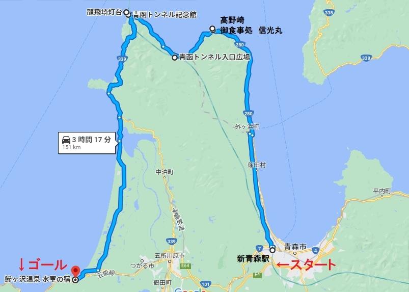 新青森からレンタカーで津軽半島の先端、高野崎、龍飛崎まで向かった後、宿泊する鯵ヶ沢温泉まで南下する、約150kmルートです。運転時間のみで約3時間、観光しながらトータル6時間くらいかけて進みます。 -