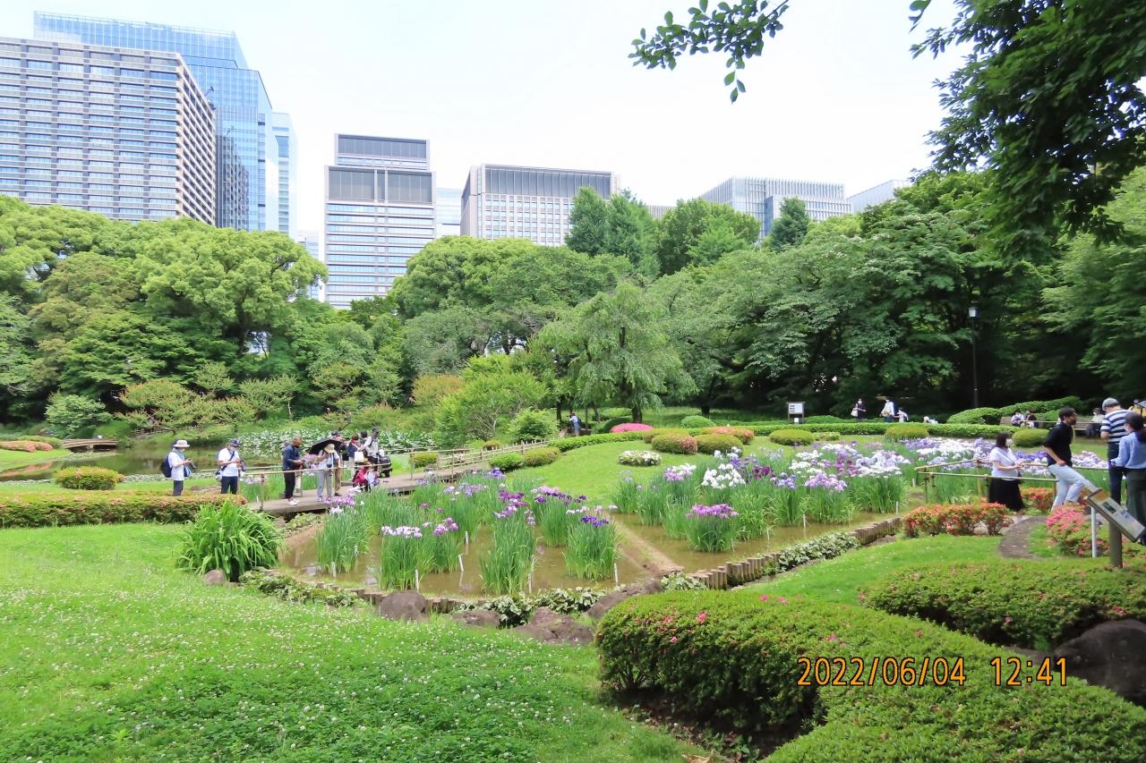 6月4日、午後0時10分過ぎに大手門に入りました。大手門~大手櫓門を過ぎて皇居東御苑に入りました。 その後、大手休憩所、同心番所、二の丸休憩所、新雑木林を過ぎて二の丸庭園の菖蒲田に出ました。 丁度見ごろの美しい菖蒲園が見られました。 まだ残っているサツキの花とのコラボレーションは見事でした。