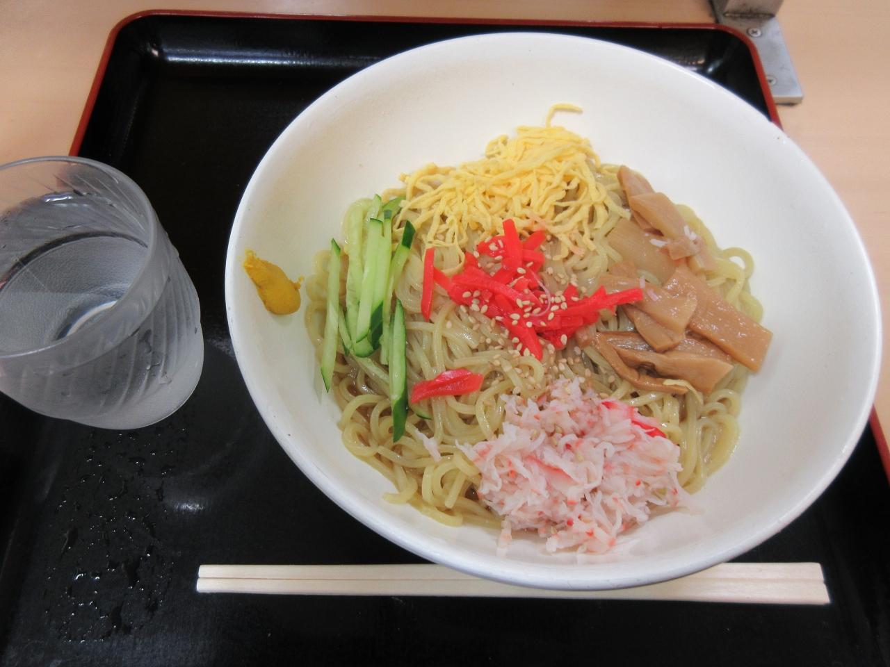 冷たい中華麺に、錦糸玉子、カニカマ、キュウリ、メンマ、紅ショウガの5種類の具が乗って、汁は少ない。