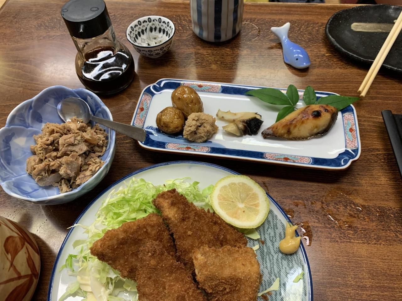 クーポンでマグロの角煮もいただきました。上の四角いお皿は刺身定食の一部。どれもこれも大満足の美味しさでした。このお店のためにまた湯河原に来たい!