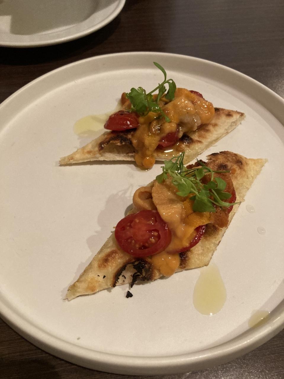 パンではなくて、薄いピザ生地のようなものにウニがのっかってました。うまーい♪ -