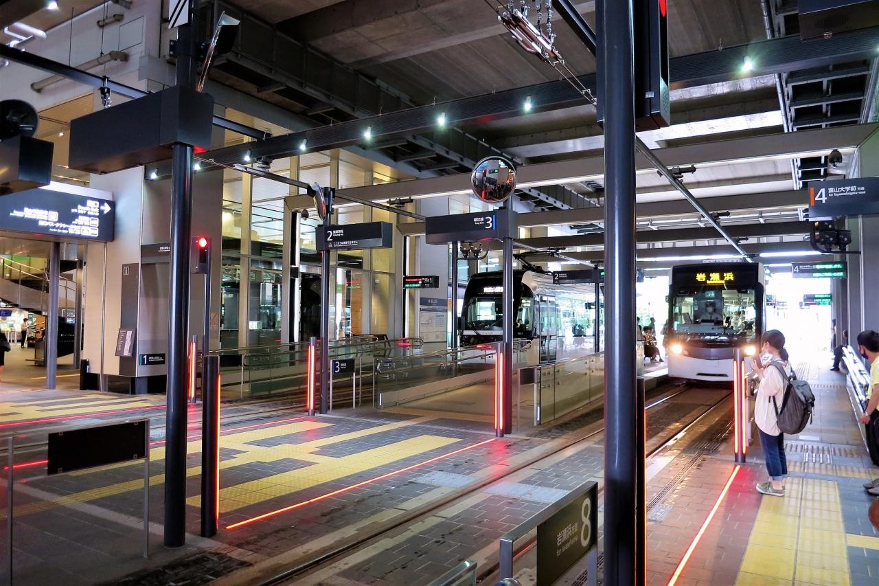 市内電車(軌道線)の乗り場は、北陸新幹線・JR高山本線・あいの風とやま鉄道線の高架下に垂直で交わるようにあります。正式名は「富山駅停留場」です。