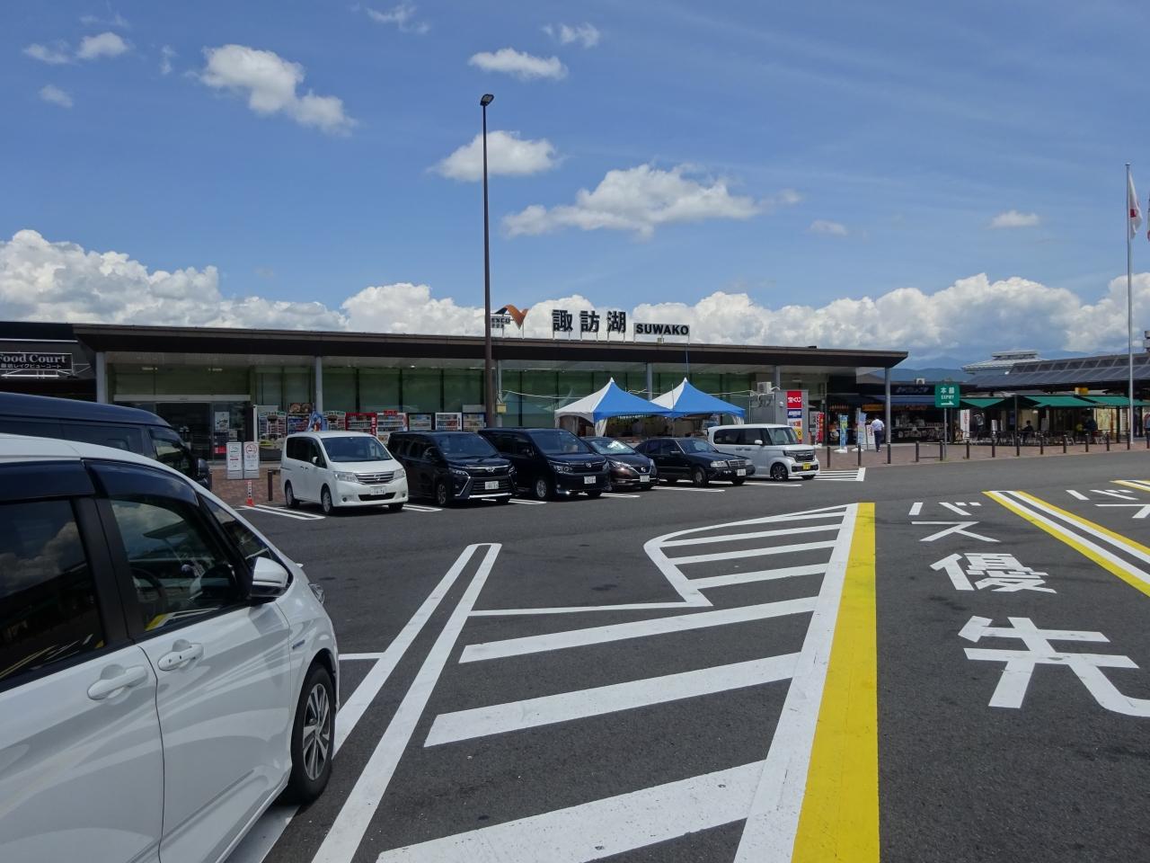 写真は、諏訪湖SAになります。時間は13時頃、距離にして約500Km走ってきました。次の諏訪ICで降ります。 -